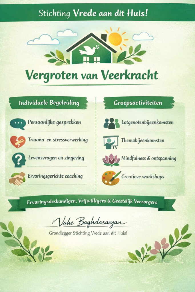 De Stichting ‘Vrede aan dit Huis!’ beoogt herstelondersteunende zorg, steun en begeleiding te bieden aan vluchtelingen, anderen in het sociale domein en hun leefomgeving. Daarmee voorziet de Stichting in een dringende behoefte die momenteel nog niet wordt ingevuld in Nederland: de deelnemers helpen om hun innerlijke krachtbronnen te (her)vinden. De zorg, steun en begeleiding vindt plaats door middel van een combinatie van multidimensionale geestelijke verzorging en ervaringsdeskundigheid. Daarbij wordt onder meer een nieuw ontwikkelde 12-stappenmodule gebruikt, die zijn waarde inmiddels in de praktijk heeft bewezen.