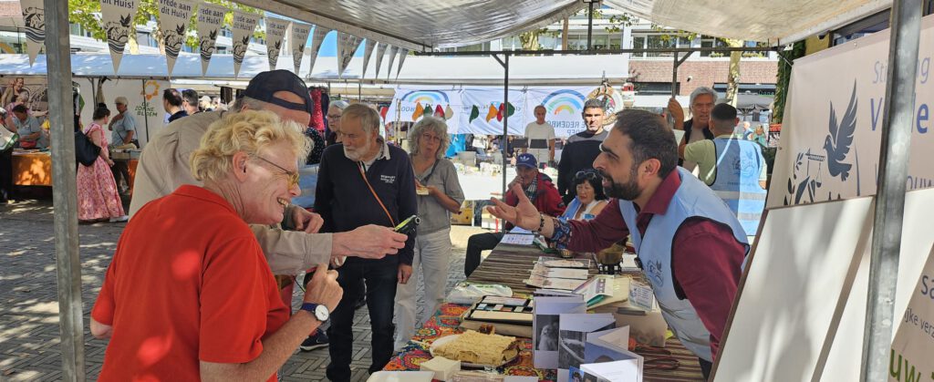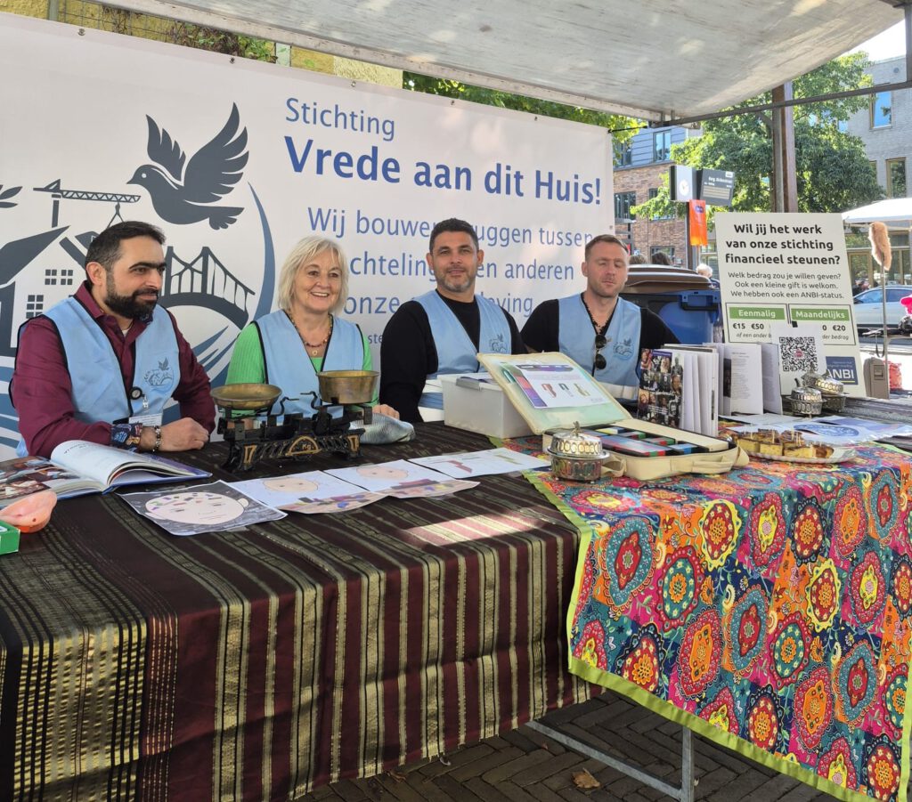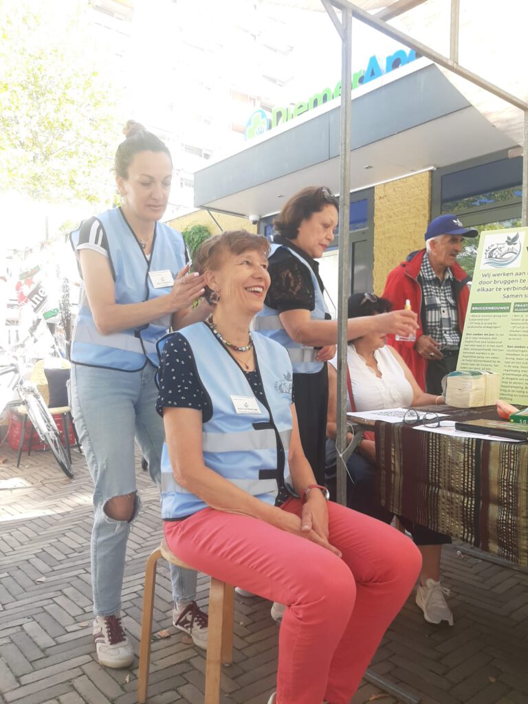 Oekraïense vrijwilligers Tetiana en Ira hadden heerlijke cake en koekjes gebakken. Dariusz, Issa, Gosha, Yurii, Hussein, Marwan en Vahe bouwden de kraam op met alle versieringen. Mariia en Alla maakte hennaversieringen en zorgden voor een ontspannende, hoofdmassage, Mariia schnminkte het logo van onze stichting en Alle onderzocht levensvragen met hulp van numerologie. Riekje, Monique en Vahe voerden veel zingevings- en bruggenbouwersgesprekken met passanten.
